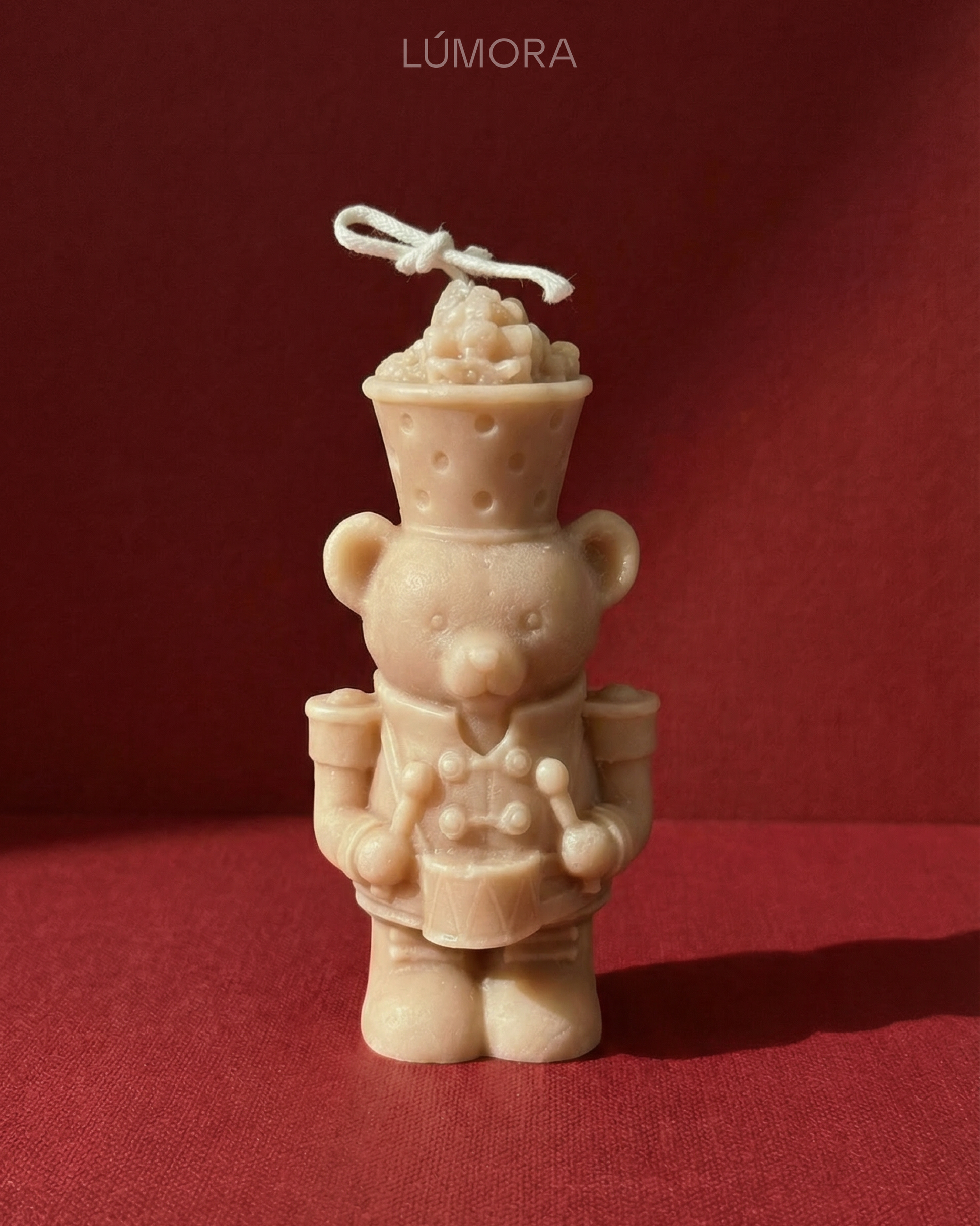 Diese Teddy Bear Nutcracker Drummer Candle wird in liebevoller Handarbeit aus 100 % natürlichem, veganem Sojawachs gefertigt. Die Kombination aus Teddybär-Form und klassischem Nussknacker-Trommler macht sie zu einem besonderen Weihnachts-Deko-Highlight mit verspieltem Charakter.